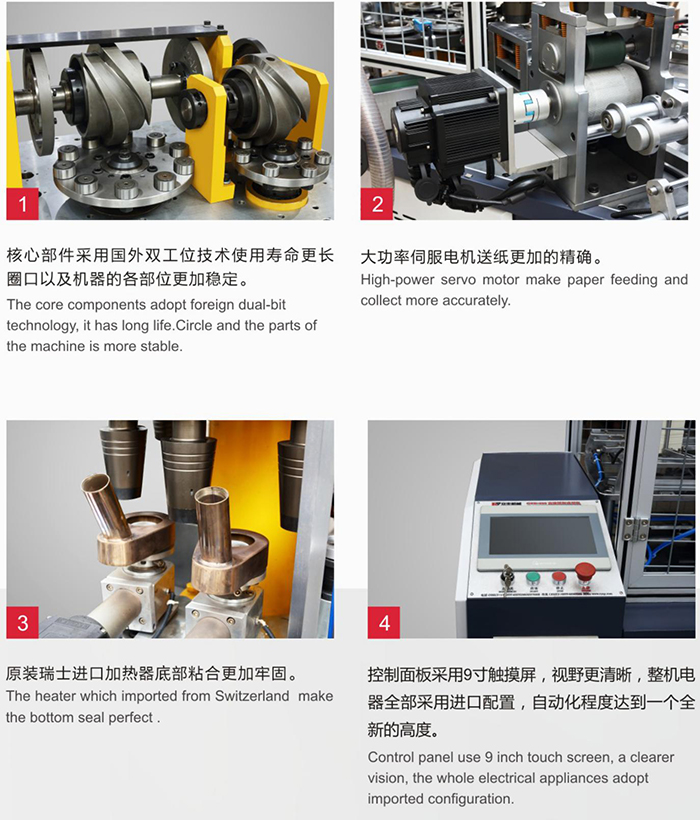 GZB-600型高速纸杯机成型机是一种双转盘,双分割器的高性能自动机械,具有自动送纸、进口加热器封口、杯口润滑、自动送杯底、滚压、双工位卷口和自动收杯等功能,生产杯型有单面和双面淋膜的冷饮杯,奶茶杯等各种杯型。